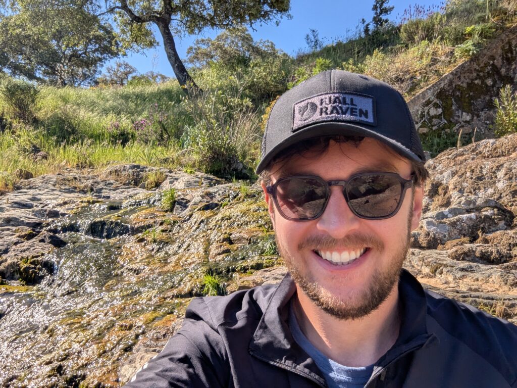 I kept an eye on my water supply and found a picturesque spot by a small stream to take a break. Sitting on a bench, spooning hummus, I realized I had already let go of a good amount of mental baggage and felt completely content. After an incredibly steep climb — where even most mountain bikers dismounted in awe — I was rewarded at the Mirador del Cerro del Calvario with a stunning panoramic view.