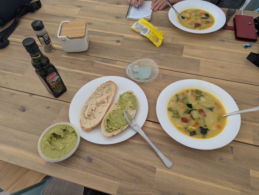 The day was amazing. I treated myself to a rest day. After a good amount of sleep, the 14 km practically walked themselves. I used the time to cook a nice vegan meal. The modern, well-equipped hostel was perfect for it. I made a large vegetable soup with fresh, crunchy bread to share. Bouillon cubes are worth their weight in gold here – not to be underestimated in terms of taste. A good meal full of electrolytes and vitamins. And that cozy feeling that only a warm soup can bring.
