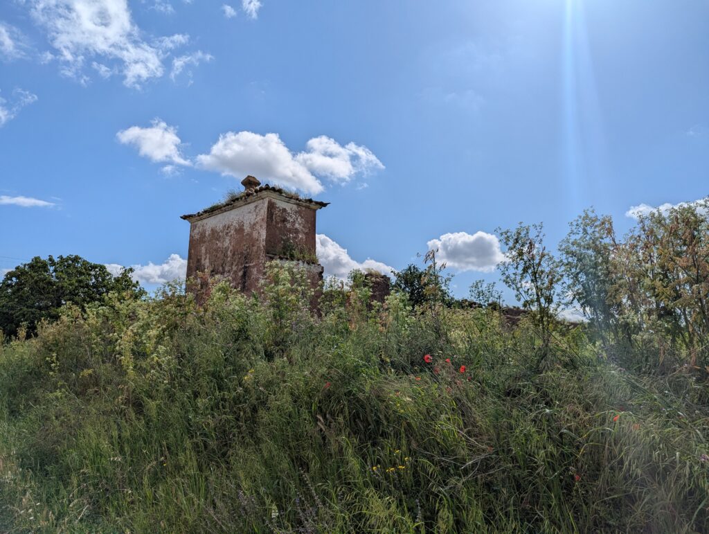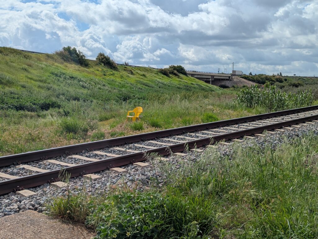 Das Wetter war in den letzten Tagen durchwachsen: grau, windig und regnerisch. Es gibt überall Störche. Sei es auf Kirchtürmen oder Scheunen. Wenn man ganz leise ist und ein wenig Glück hat, hört man sie sogar klappern. An dieser Etappe war besonders kurios, dass man Bahngleise ohne jegliche Sicherung überquert, die offensichtlich benutzt werden. Der Weg wird natürlich getreu mit gelben Hinweisen gezeigt. Hier sogar mit einem gelben Plastikstuhl, der zum Verweilen an den Gleisen einlud. Da kann man nur hoffen, dass niemand hier seinen schwarzen Humor verfolgte.