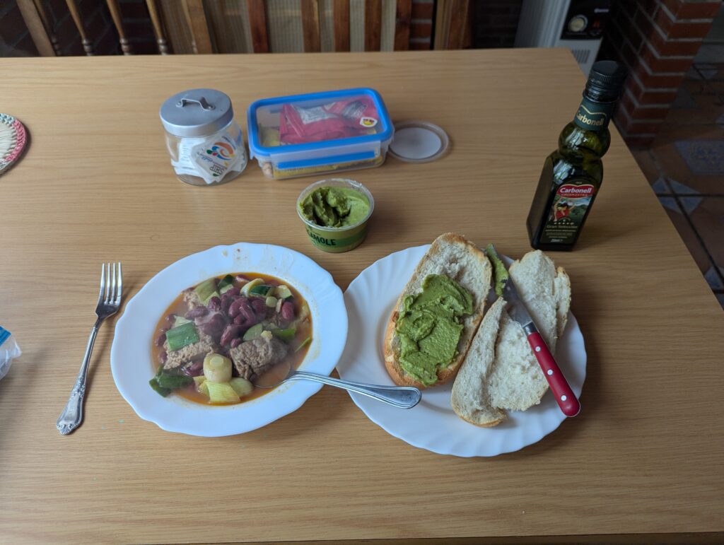 Nachdem ich gestern mit meiner kalten und modrigen Unterkunft kein Glück hatte, kam mir die heutige kleine Pension sehr gelegen. Sie war sehr gemütlich und bot ein schönes Badezimmer und sogar einen kleinen Kühlschrank im Zimmer. Es gab sogar eine kleine Dachterrasse, wo die Wäsche trotz des unbeständigen Wetters trocken wurde. Es ist erstaunlich, dass der Körper sich richtig auf die Vitamine und das Essen zu freuen scheint. Ich versuche einfach, aber ausgewogen zu kochen. Die kleine Flasche Olivenöl ist zwar nicht sonderlich leicht, macht sich allerdings unersetzbar für den wandernden Feinschmecker. Schnell hat man mit einer Zwiebel, Gemüse und einer Dose Bohnen sowie dem unerlässlichen Brühwürfel einen herzhaften Eintopf gezaubert. Der wärmt nicht nur, sondern scheint auch genau das zu liefern, was man braucht, um sich zu regenerieren.